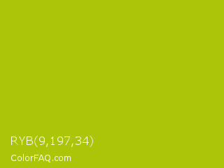RYB 9,197,34 Color is a normal yellow color and the nearest color is Bahia #a5cb0c. Hex code #acc509 and RGB value is rgb(172,197,9). In RGB color space, this color is composed of 67% red, 77% green, 4% blue, In CMYK color space, this color is composed of 13% cyan, 0% magenta, 95% yellow , 23% black , In HSL color space, this color has a hue angle of 68° , 91% saturation and 40% lightness.