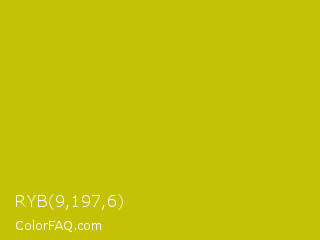 RYB 9,197,6 Color is a normal yellow color and the nearest color is Rio Grande #bbd009. Hex code #c5c206 and RGB value is rgb(197,194,6). In RGB color space, this color is composed of 77% red, 76% green, 2% blue, In CMYK color space, this color is composed of 0% cyan, 2% magenta, 97% yellow , 23% black , In HSL color space, this color has a hue angle of 59° , 94% saturation and 40% lightness.