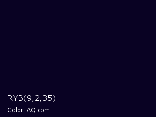 RYB 9,2,35 Color is a almost black indigo color and the nearest color is Black Russian #0a001c. Hex code #090223 and RGB value is rgb(9,2,35). In RGB color space, this color is composed of 4% red, 1% green, 14% blue, In CMYK color space, this color is composed of 74% cyan, 94% magenta, 0% yellow , 86% black , In HSL color space, this color has a hue angle of 253° , 89% saturation and 7% lightness.