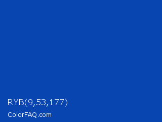 RYB 9,53,177 Color is a normal blue color and the nearest color is Cobalt #0047ab. Hex code #0945b1 and RGB value is rgb(9,69,177). In RGB color space, this color is composed of 4% red, 27% green, 69% blue, In CMYK color space, this color is composed of 95% cyan, 61% magenta, 0% yellow , 31% black , In HSL color space, this color has a hue angle of 219° , 90% saturation and 36% lightness.