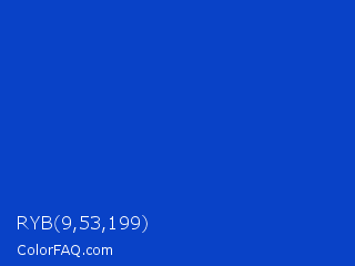 RYB 9,53,199 Color is a normal blue color and the nearest color is Absolute Zero #0048ba. Hex code #0942c7 and RGB value is rgb(9,66,199). In RGB color space, this color is composed of 4% red, 26% green, 78% blue, In CMYK color space, this color is composed of 95% cyan, 67% magenta, 0% yellow , 22% black , In HSL color space, this color has a hue angle of 222° , 91% saturation and 41% lightness.