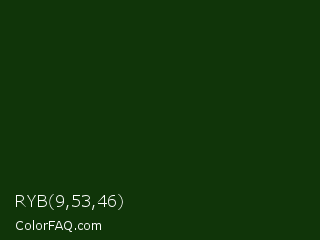 RYB 9,53,46 Color is a very dark green color and the nearest color is Palm Leaf #19330e. Hex code #103509 and RGB value is rgb(16,53,9). In RGB color space, this color is composed of 6% red, 21% green, 4% blue, In CMYK color space, this color is composed of 70% cyan, 0% magenta, 83% yellow , 79% black , In HSL color space, this color has a hue angle of 110° , 71% saturation and 12% lightness.