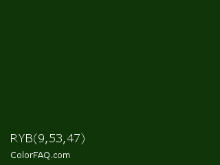 RYB 9,53,47 Color is a very dark green color and the nearest color is Palm Leaf #19330e. Hex code #0f3509 and RGB value is rgb(15,53,9). In RGB color space, this color is composed of 6% red, 21% green, 4% blue, In CMYK color space, this color is composed of 72% cyan, 0% magenta, 83% yellow , 79% black , In HSL color space, this color has a hue angle of 112° , 71% saturation and 12% lightness.