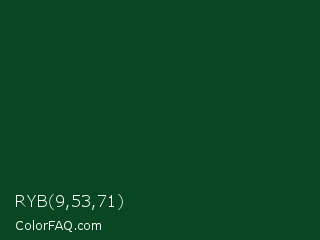 RYB 9,53,71 Color is a very dark green color and the nearest color is Forest Green #014421. Hex code #094722 and RGB value is rgb(9,71,34). In RGB color space, this color is composed of 4% red, 28% green, 13% blue, In CMYK color space, this color is composed of 87% cyan, 0% magenta, 52% yellow , 72% black , In HSL color space, this color has a hue angle of 144° , 78% saturation and 16% lightness.