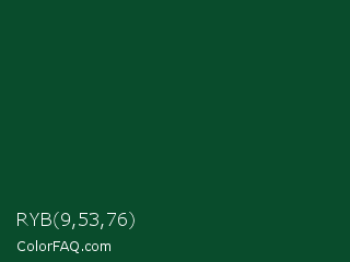 RYB 9,53,76 Color is a very dark green color and the nearest color is Sherwood Green #02402c. Hex code #094c2c and RGB value is rgb(9,76,44). In RGB color space, this color is composed of 4% red, 30% green, 17% blue, In CMYK color space, this color is composed of 88% cyan, 0% magenta, 42% yellow , 70% black , In HSL color space, this color has a hue angle of 151° , 79% saturation and 17% lightness.