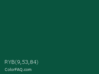 RYB 9,53,84 Color is a very dark green color and the nearest color is Sacramento State Green #00563f. Hex code #09543e and RGB value is rgb(9,84,62). In RGB color space, this color is composed of 4% red, 33% green, 24% blue, In CMYK color space, this color is composed of 89% cyan, 0% magenta, 26% yellow , 67% black , In HSL color space, this color has a hue angle of 162° , 81% saturation and 18% lightness.