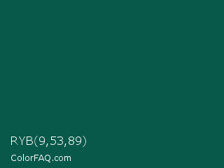 RYB 9,53,89 Color is a very dark cyan color and the nearest color is Eden #105852. Hex code #09594a and RGB value is rgb(9,89,74). In RGB color space, this color is composed of 4% red, 35% green, 29% blue, In CMYK color space, this color is composed of 90% cyan, 0% magenta, 17% yellow , 65% black , In HSL color space, this color has a hue angle of 169° , 82% saturation and 19% lightness.