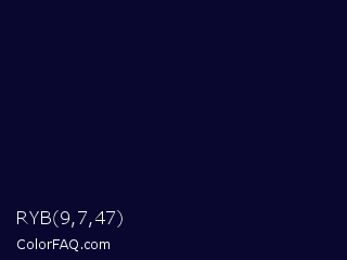 RYB 9,7,47 Color is a very dark indigo color and the nearest color is Black Rock #0d0332. Hex code #09072f and RGB value is rgb(9,7,47). In RGB color space, this color is composed of 4% red, 3% green, 18% blue, In CMYK color space, this color is composed of 81% cyan, 85% magenta, 0% yellow , 82% black , In HSL color space, this color has a hue angle of 243° , 74% saturation and 11% lightness.