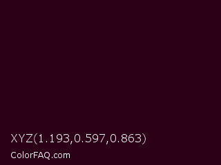 XYZ 1.193,0.597,0.863 Color is a almost black rose color and the nearest color is Toledo #3a0020. Hex code #2c0017 and RGB value is rgb(44,0,23). In RGB color space, this color is composed of 17% red, 0% green, 9% blue, In CMYK color space, this color is composed of 0% cyan, 100% magenta, 48% yellow , 83% black , In HSL color space, this color has a hue angle of 329° , 100% saturation and 9% lightness.