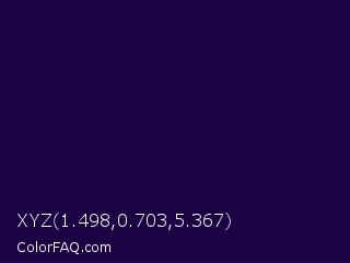 XYZ 1.498,0.703,5.367 Color is a very dark violet color and the nearest color is Tolopea #1b0245. Hex code #1b0343 and RGB value is rgb(27,3,67). In RGB color space, this color is composed of 11% red, 1% green, 26% blue, In CMYK color space, this color is composed of 60% cyan, 96% magenta, 0% yellow , 74% black , In HSL color space, this color has a hue angle of 263° , 91% saturation and 14% lightness.