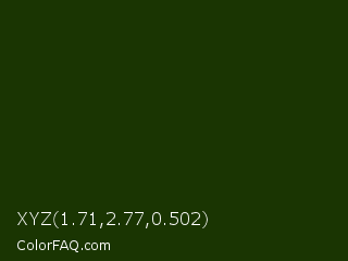 XYZ 1.71,2.77,0.502 Color is a very dark green color and the nearest color is Deep Forest Green #182d09. Hex code #1a3502 and RGB value is rgb(26,53,2). In RGB color space, this color is composed of 10% red, 21% green, 1% blue, In CMYK color space, this color is composed of 51% cyan, 0% magenta, 96% yellow , 79% black , In HSL color space, this color has a hue angle of 92° , 93% saturation and 11% lightness.