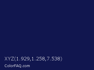 XYZ 1.929,1.258,7.538 Color is a very dark blue color and the nearest color is Bunting #151f4c. Hex code #11164f and RGB value is rgb(17,22,79). In RGB color space, this color is composed of 7% red, 9% green, 31% blue, In CMYK color space, this color is composed of 78% cyan, 72% magenta, 0% yellow , 69% black , In HSL color space, this color has a hue angle of 235° , 65% saturation and 19% lightness.