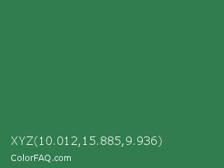 XYZ 10.012,15.885,9.936 Color is a normal green color and the nearest color is Goblin #3d7d52. Hex code #317d4f and RGB value is rgb(49,125,79). In RGB color space, this color is composed of 19% red, 49% green, 31% blue, In CMYK color space, this color is composed of 61% cyan, 0% magenta, 37% yellow , 51% black , In HSL color space, this color has a hue angle of 144° , 44% saturation and 34% lightness.