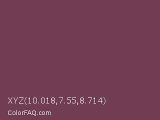 XYZ 10.018,7.55,8.714 Color is a normal rose color and the nearest color is Deep Tuscan Red #66424d. Hex code #713e51 and RGB value is rgb(113,62,81). In RGB color space, this color is composed of 44% red, 24% green, 32% blue, In CMYK color space, this color is composed of 0% cyan, 45% magenta, 28% yellow , 56% black , In HSL color space, this color has a hue angle of 338° , 29% saturation and 34% lightness.