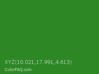 XYZ 10.021,17.991,4.613 Color is a normal green color and the nearest color is Forest Green #228b22. Hex code #2c8724 and RGB value is rgb(44,135,36). In RGB color space, this color is composed of 17% red, 53% green, 14% blue, In CMYK color space, this color is composed of 67% cyan, 0% magenta, 73% yellow , 47% black , In HSL color space, this color has a hue angle of 115° , 58% saturation and 34% lightness.