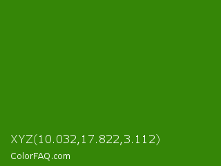 XYZ 10.032,17.822,3.112 Color is a dark green color and the nearest color is Napier Green #2a8000. Hex code #358607 and RGB value is rgb(53,134,7). In RGB color space, this color is composed of 21% red, 53% green, 3% blue, In CMYK color space, this color is composed of 60% cyan, 0% magenta, 95% yellow , 47% black , In HSL color space, this color has a hue angle of 98° , 90% saturation and 28% lightness.