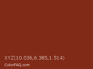 XYZ 10.036,6.385,1.514 Color is a dark red color and the nearest color is Pueblo #7d2c14. Hex code #812a17 and RGB value is rgb(129,42,23). In RGB color space, this color is composed of 51% red, 16% green, 9% blue, In CMYK color space, this color is composed of 0% cyan, 67% magenta, 82% yellow , 49% black , In HSL color space, this color has a hue angle of 11° , 70% saturation and 30% lightness.