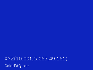 XYZ 10.091,5.065,49.161 Color is a normal blue color and the nearest color is Persian Blue #1c39bb. Hex code #0d24be and RGB value is rgb(13,36,190). In RGB color space, this color is composed of 5% red, 14% green, 75% blue, In CMYK color space, this color is composed of 93% cyan, 81% magenta, 0% yellow , 25% black , In HSL color space, this color has a hue angle of 232° , 87% saturation and 40% lightness.