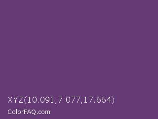 XYZ 10.091,7.077,17.664 Color is a normal purple color and the nearest color is Imperial #602f6b. Hex code #653a75 and RGB value is rgb(101,58,117). In RGB color space, this color is composed of 40% red, 23% green, 46% blue, In CMYK color space, this color is composed of 14% cyan, 50% magenta, 0% yellow , 54% black , In HSL color space, this color has a hue angle of 284° , 34% saturation and 34% lightness.