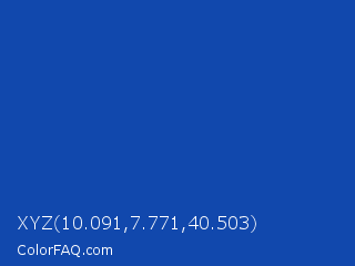 XYZ 10.091,7.771,40.503 Color is a normal blue color and the nearest color is Tory Blue #1450aa. Hex code #1148ad and RGB value is rgb(17,72,173). In RGB color space, this color is composed of 7% red, 28% green, 68% blue, In CMYK color space, this color is composed of 90% cyan, 58% magenta, 0% yellow , 32% black , In HSL color space, this color has a hue angle of 219° , 82% saturation and 37% lightness.