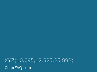 XYZ 10.095,12.325,25.892 Color is a normal blue color and the nearest color is Blue Sapphire #126180. Hex code #176a8a and RGB value is rgb(23,106,138). In RGB color space, this color is composed of 9% red, 42% green, 54% blue, In CMYK color space, this color is composed of 83% cyan, 23% magenta, 0% yellow , 46% black , In HSL color space, this color has a hue angle of 197° , 71% saturation and 32% lightness.