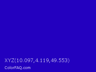 XYZ 10.097,4.119,49.553 Color is a normal indigo color and the nearest color is Interdimensional Blue #360ccc. Hex code #2300bf and RGB value is rgb(35,0,191). In RGB color space, this color is composed of 14% red, 0% green, 75% blue, In CMYK color space, this color is composed of 82% cyan, 100% magenta, 0% yellow , 25% black , In HSL color space, this color has a hue angle of 251° , 100% saturation and 37% lightness.