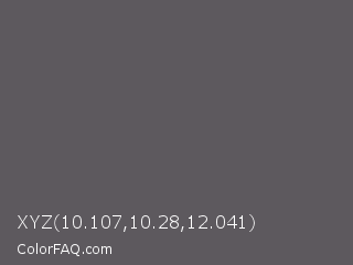 XYZ 10.107,10.28,12.041 Color is a normal purple color and the nearest color is Chicago #5d5c58. Hex code #5d595e and RGB value is rgb(93,89,94). In RGB color space, this color is composed of 36% red, 35% green, 37% blue, In CMYK color space, this color is composed of 1% cyan, 5% magenta, 0% yellow , 63% black , In HSL color space, this color has a hue angle of 288° , 3% saturation and 36% lightness.