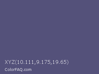 XYZ 10.111,9.175,19.65 Color is a normal indigo color and the nearest color is Purple Navy #4e5180. Hex code #54517a and RGB value is rgb(84,81,122). In RGB color space, this color is composed of 33% red, 32% green, 48% blue, In CMYK color space, this color is composed of 31% cyan, 34% magenta, 0% yellow , 52% black , In HSL color space, this color has a hue angle of 244° , 20% saturation and 40% lightness.
