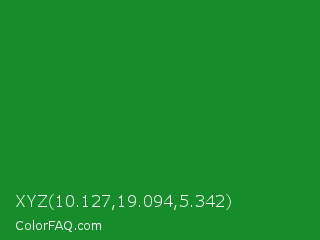 XYZ 10.127,19.094,5.342 Color is a normal green color and the nearest color is Forest Green #228b22. Hex code #168c2a and RGB value is rgb(22,140,42). In RGB color space, this color is composed of 9% red, 55% green, 16% blue, In CMYK color space, this color is composed of 84% cyan, 0% magenta, 70% yellow , 45% black , In HSL color space, this color has a hue angle of 130° , 73% saturation and 32% lightness.