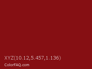 XYZ 10.12,5.457,1.136 Color is a dark red color and the nearest color is UP Maroon #7b1113. Hex code #860f13 and RGB value is rgb(134,15,19). In RGB color space, this color is composed of 53% red, 6% green, 7% blue, In CMYK color space, this color is composed of 0% cyan, 89% magenta, 86% yellow , 47% black , In HSL color space, this color has a hue angle of 358° , 80% saturation and 29% lightness.