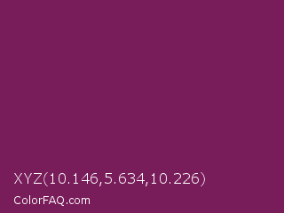 XYZ 10.146,5.634,10.226 Color is a dark magenta color and the nearest color is French Plum #811453. Hex code #791c5a and RGB value is rgb(121,28,90). In RGB color space, this color is composed of 47% red, 11% green, 35% blue, In CMYK color space, this color is composed of 0% cyan, 77% magenta, 26% yellow , 53% black , In HSL color space, this color has a hue angle of 320° , 62% saturation and 29% lightness.