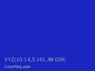 XYZ 10.14,5.161,48.039 Color is a normal blue color and the nearest color is Persian Blue #1c39bb. Hex code #1925bc and RGB value is rgb(25,37,188). In RGB color space, this color is composed of 10% red, 15% green, 74% blue, In CMYK color space, this color is composed of 87% cyan, 80% magenta, 0% yellow , 26% black , In HSL color space, this color has a hue angle of 236° , 77% saturation and 42% lightness.