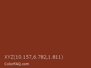 XYZ 10.157,6.782,1.811 Color is a dark red color and the nearest color is Red Robin #80341f. Hex code #80301b and RGB value is rgb(128,48,27). In RGB color space, this color is composed of 50% red, 19% green, 11% blue, In CMYK color space, this color is composed of 0% cyan, 63% magenta, 79% yellow , 50% black , In HSL color space, this color has a hue angle of 12° , 65% saturation and 30% lightness.