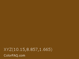 XYZ 10.15,8.857,1.665 Color is a dark orange color and the nearest color is Raw Umber #734a12. Hex code #774a10 and RGB value is rgb(119,74,16). In RGB color space, this color is composed of 47% red, 29% green, 6% blue, In CMYK color space, this color is composed of 0% cyan, 38% magenta, 87% yellow , 53% black , In HSL color space, this color has a hue angle of 34° , 76% saturation and 26% lightness.