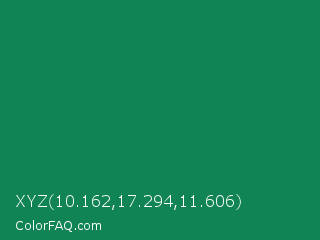 XYZ 10.162,17.294,11.606 Color is a dark green color and the nearest color is Deep Green Cyan Turquoise #0e7c61. Hex code #118456 and RGB value is rgb(17,132,86). In RGB color space, this color is composed of 7% red, 52% green, 34% blue, In CMYK color space, this color is composed of 87% cyan, 0% magenta, 35% yellow , 48% black , In HSL color space, this color has a hue angle of 156° , 77% saturation and 29% lightness.