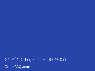 XYZ 10.16,7.468,38.936 Color is a normal blue color and the nearest color is Denim Blue #2243b6. Hex code #2744aa and RGB value is rgb(39,68,170). In RGB color space, this color is composed of 15% red, 27% green, 67% blue, In CMYK color space, this color is composed of 77% cyan, 60% magenta, 0% yellow , 33% black , In HSL color space, this color has a hue angle of 227° , 63% saturation and 41% lightness.