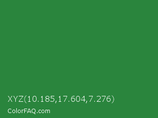 XYZ 10.185,17.604,7.276 Color is a normal green color and the nearest color is Sea Green #2e8b57. Hex code #2a853d and RGB value is rgb(42,133,61). In RGB color space, this color is composed of 16% red, 52% green, 24% blue, In CMYK color space, this color is composed of 68% cyan, 0% magenta, 54% yellow , 48% black , In HSL color space, this color has a hue angle of 133° , 52% saturation and 34% lightness.