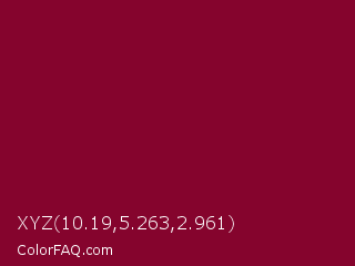 XYZ 10.19,5.263,2.961 Color is a dark rose color and the nearest color is Paprika #8d0226. Hex code #85042d and RGB value is rgb(133,4,45). In RGB color space, this color is composed of 52% red, 2% green, 18% blue, In CMYK color space, this color is composed of 0% cyan, 97% magenta, 66% yellow , 48% black , In HSL color space, this color has a hue angle of 341° , 94% saturation and 27% lightness.