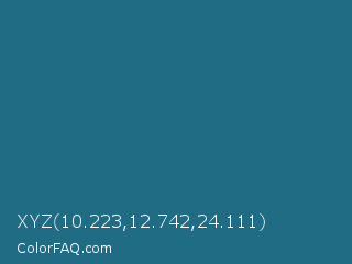 XYZ 10.223,12.742,24.111 Color is a normal blue color and the nearest color is Elm #1c7c7d. Hex code #216c85 and RGB value is rgb(33,108,133). In RGB color space, this color is composed of 13% red, 42% green, 52% blue, In CMYK color space, this color is composed of 75% cyan, 19% magenta, 0% yellow , 48% black , In HSL color space, this color has a hue angle of 195° , 60% saturation and 33% lightness.