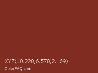 XYZ 10.228,6.578,2.169 Color is a normal red color and the nearest color is Red Robin #80341f. Hex code #812c21 and RGB value is rgb(129,44,33). In RGB color space, this color is composed of 51% red, 17% green, 13% blue, In CMYK color space, this color is composed of 0% cyan, 66% magenta, 74% yellow , 49% black , In HSL color space, this color has a hue angle of 7° , 59% saturation and 32% lightness.