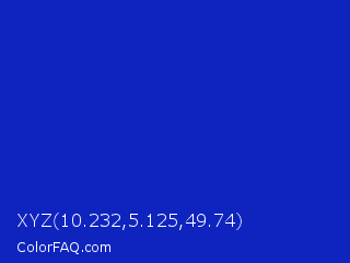 XYZ 10.232,5.125,49.74 Color is a normal blue color and the nearest color is Persian Blue #1c39bb. Hex code #0f24bf and RGB value is rgb(15,36,191). In RGB color space, this color is composed of 6% red, 14% green, 75% blue, In CMYK color space, this color is composed of 92% cyan, 81% magenta, 0% yellow , 25% black , In HSL color space, this color has a hue angle of 233° , 85% saturation and 40% lightness.