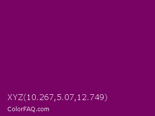 XYZ 10.267,5.07,12.749 Color is a dark magenta color and the nearest color is Cardinal Pink #8c055e. Hex code #790365 and RGB value is rgb(121,3,101). In RGB color space, this color is composed of 47% red, 1% green, 40% blue, In CMYK color space, this color is composed of 0% cyan, 98% magenta, 17% yellow , 53% black , In HSL color space, this color has a hue angle of 310° , 95% saturation and 24% lightness.