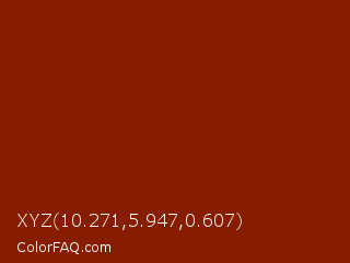 XYZ 10.271,5.947,0.607 Color is a dark red color and the nearest color is Kenyan Copper #7c1c05. Hex code #861d00 and RGB value is rgb(134,29,0). In RGB color space, this color is composed of 53% red, 11% green, 0% blue, In CMYK color space, this color is composed of 0% cyan, 78% magenta, 100% yellow , 47% black , In HSL color space, this color has a hue angle of 13° , 100% saturation and 26% lightness.