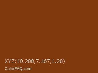 XYZ 10.288,7.467,1.28 Color is a dark orange color and the nearest color is Copper Canyon #7e3a15. Hex code #7f390d and RGB value is rgb(127,57,13). In RGB color space, this color is composed of 50% red, 22% green, 5% blue, In CMYK color space, this color is composed of 0% cyan, 55% magenta, 90% yellow , 50% black , In HSL color space, this color has a hue angle of 23° , 81% saturation and 27% lightness.