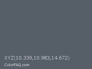 XYZ 10.339,10.983,14.672 Color is a normal blue color and the nearest color is Black Coral #54626f. Hex code #565e68 and RGB value is rgb(86,94,104). In RGB color space, this color is composed of 34% red, 37% green, 41% blue, In CMYK color space, this color is composed of 17% cyan, 10% magenta, 0% yellow , 59% black , In HSL color space, this color has a hue angle of 213° , 9% saturation and 37% lightness.