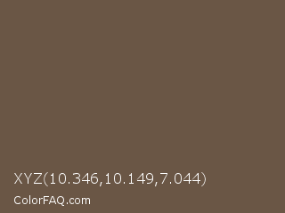 XYZ 10.346,10.149,7.044 Color is a normal orange color and the nearest color is Umber #635147. Hex code #6a5645 and RGB value is rgb(106,86,69). In RGB color space, this color is composed of 42% red, 34% green, 27% blue, In CMYK color space, this color is composed of 0% cyan, 19% magenta, 35% yellow , 58% black , In HSL color space, this color has a hue angle of 28° , 21% saturation and 34% lightness.