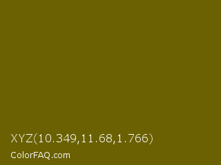 XYZ 10.349,11.68,1.766 Color is a very dark yellow color and the nearest color is Spicy Mustard #74640d. Hex code #6b6102 and RGB value is rgb(107,97,2). In RGB color space, this color is composed of 42% red, 38% green, 1% blue, In CMYK color space, this color is composed of 0% cyan, 9% magenta, 98% yellow , 58% black , In HSL color space, this color has a hue angle of 54° , 96% saturation and 21% lightness.