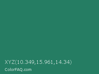 XYZ 10.349,15.961,14.34 Color is a normal green color and the nearest color is Eucalyptus #278a5b. Hex code #257d63 and RGB value is rgb(37,125,99). In RGB color space, this color is composed of 15% red, 49% green, 39% blue, In CMYK color space, this color is composed of 70% cyan, 0% magenta, 21% yellow , 51% black , In HSL color space, this color has a hue angle of 162° , 54% saturation and 32% lightness.