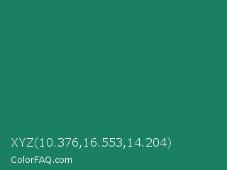 XYZ 10.376,16.553,14.204 Color is a dark green color and the nearest color is Deep Green Cyan Turquoise #0e7c61. Hex code #1b8062 and RGB value is rgb(27,128,98). In RGB color space, this color is composed of 11% red, 50% green, 38% blue, In CMYK color space, this color is composed of 79% cyan, 0% magenta, 23% yellow , 50% black , In HSL color space, this color has a hue angle of 162° , 65% saturation and 30% lightness.