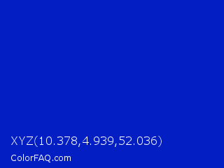 XYZ 10.378,4.939,52.036 Color is a normal blue color and the nearest color is Blue Pantone #0018a8. Hex code #031fc3 and RGB value is rgb(3,31,195). In RGB color space, this color is composed of 1% red, 12% green, 76% blue, In CMYK color space, this color is composed of 98% cyan, 84% magenta, 0% yellow , 24% black , In HSL color space, this color has a hue angle of 231° , 97% saturation and 39% lightness.